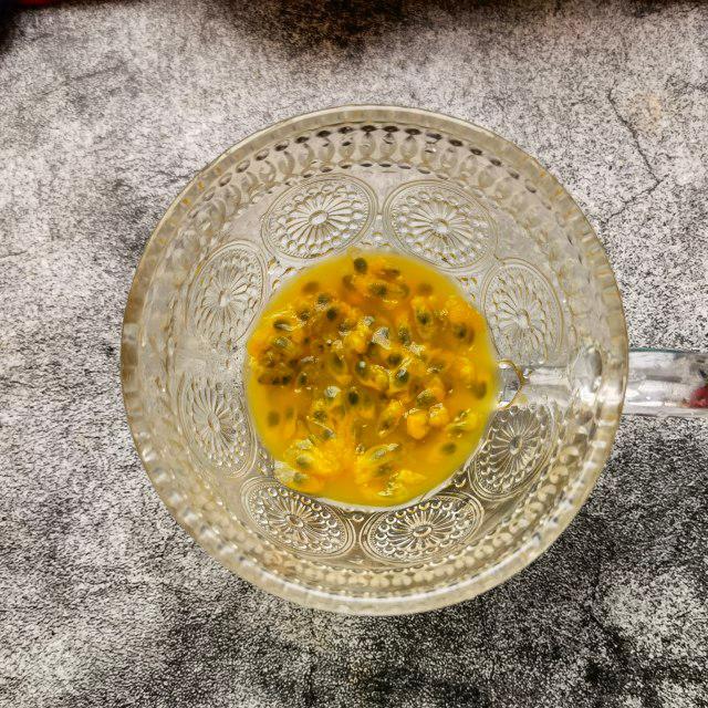 第3步、百香果挖入杯中。