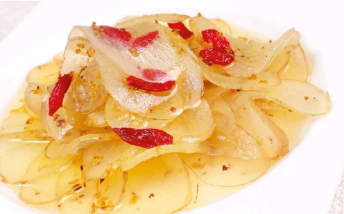 料汁的制作:锅入清水1000克烧开,加入蜂蜜200克、冰糖150克、糖桂花80克,小火熬制充分融化,下入飞过水的枸杞调匀即可。