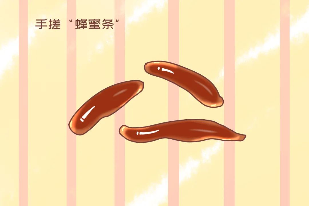 这里要注意的是,蜂蜜条的两端要保持圆润的弧度,不可尖锐,不能扎手。