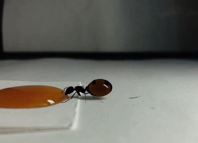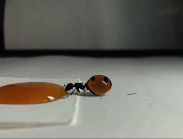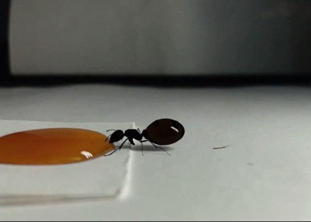 蚂蚁在蜂蜜面前开始吸了,男子就想,这个蚂蚁是怎么吃的呢,它一次性可以吸多少,这勾起了男子的好奇心,于是他就在一旁一直观察着蚂蚁,突然他感觉蚂蚁有变化了,原本黑漆漆的蚂蚁变成了别的颜色。