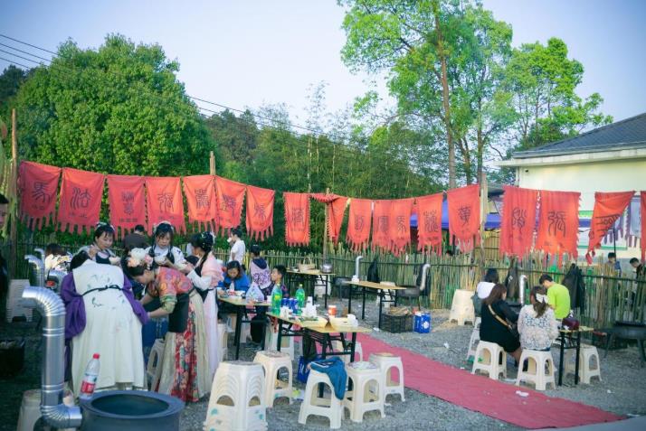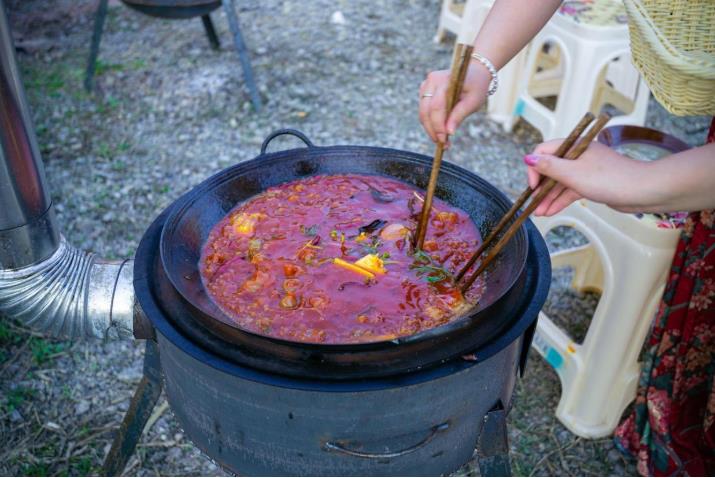 随着油菜花田的爆红,游客来的也是越来越多,于是村民们就在油菜花海的尽头,办起了农副产品的展销以及餐饮,让游客能够吃上乡村”野火锅”,主要是当地的一些野菜,菌类,以及土鸡鸭等等地道的农村食材。
