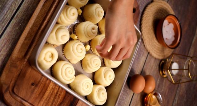 15、所有面团都做好之后,均匀地摆放在模具中,继续放入烤箱中发酵1小时左右,至体积1.5倍大即可。