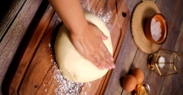 6、取出发酵好的面团,双掌按压排气。