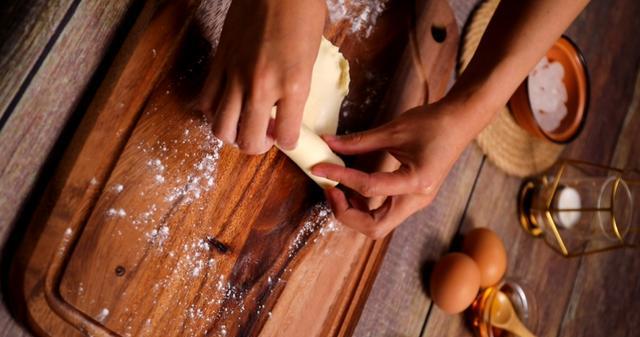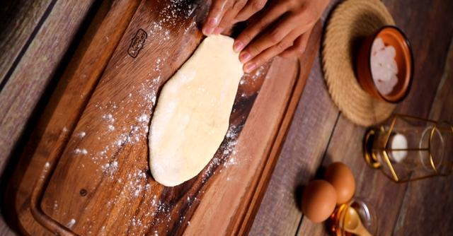 11、擀好的面团松弛几分钟之后,再按照上一步继续整形一次。