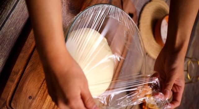 5、将面团放入烤盘中,盖上保鲜膜放入烤箱发酵一小时左右至两倍大,用手指戳面团,指洞清晰保留住就是刚刚好的状态,注意发酵时放一碗热水在面团旁边保持湿度。