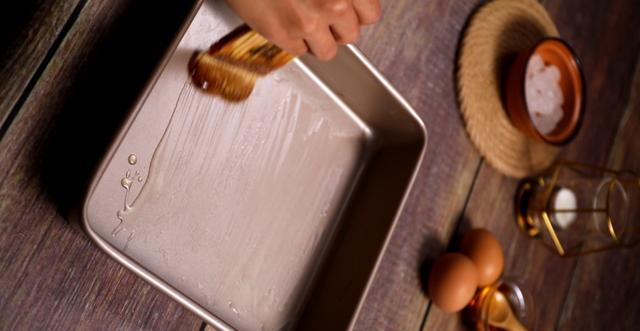 8、松弛面团的时候,在模具中倒入15g玉米油,用毛刷刷匀。