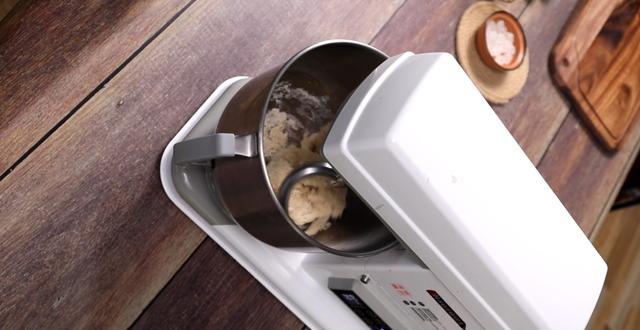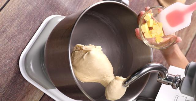 3、加入室温软化好的无盐黄油后,先用低速档搅拌面团至黄油吸收。