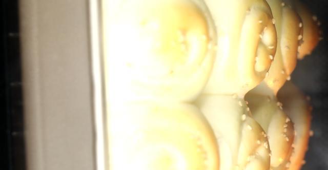16、拿出之后在面包表面刷上一层蛋液,之后撒上适量白芝麻,在空隙处放入适量黄油块。