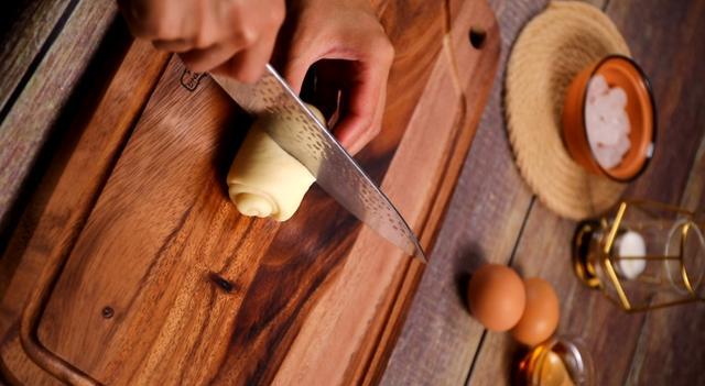 13、用锋利的刀将面团从中间对半切开。
