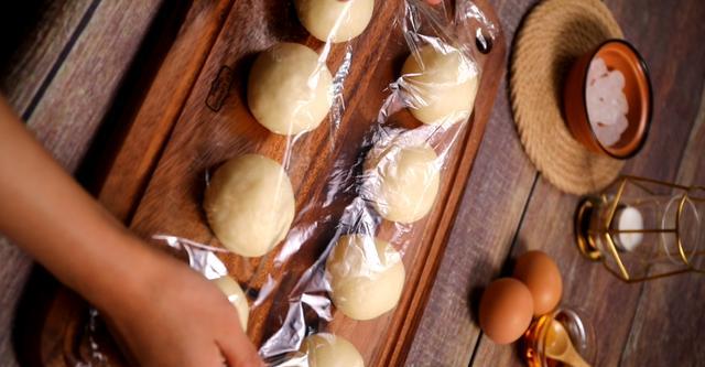 7、将面团平均分割成8份,约65g左右一个,滚圆盖保鲜膜室温松弛15分钟左右。