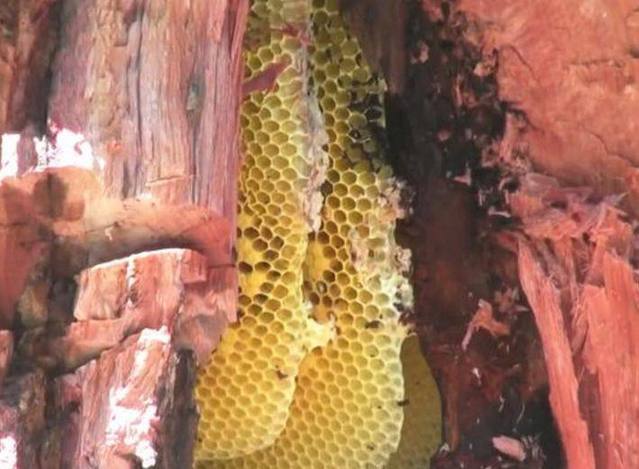 在树上砍出一个大树之后,他们的速度慢了起来,有个人拿着堆干草点燃后,又在树上砍了一下,没想到砍开后竟然发现一个蜂巢,里面满满的都是蜂蜜。没想到蜜蜂竟然把蜂巢盖到了村心里,也真的是太有才了!